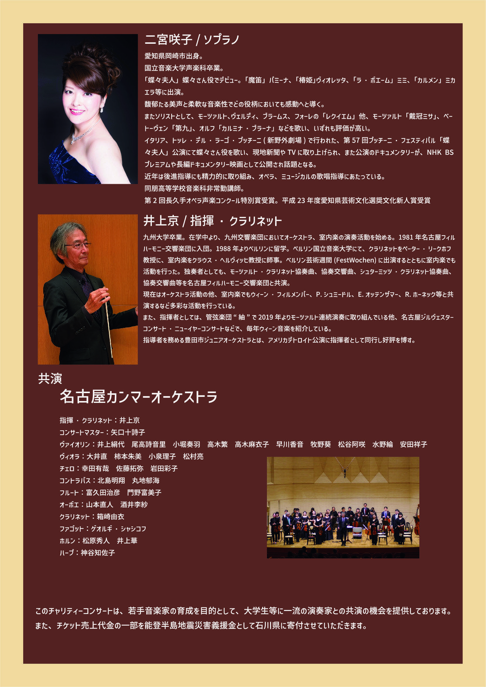 二宮咲子、名古屋カンマーオーケストラ、名古屋ヴィルトゥオーゼン、名古屋フィルハーモニー交響楽団メンバー、セントラル愛知交響楽団メンバー、中部フィルハーモニー交響楽団メンバー、豊田市ジュニアオーケストラメンバー、愛知県立芸術大学学生他